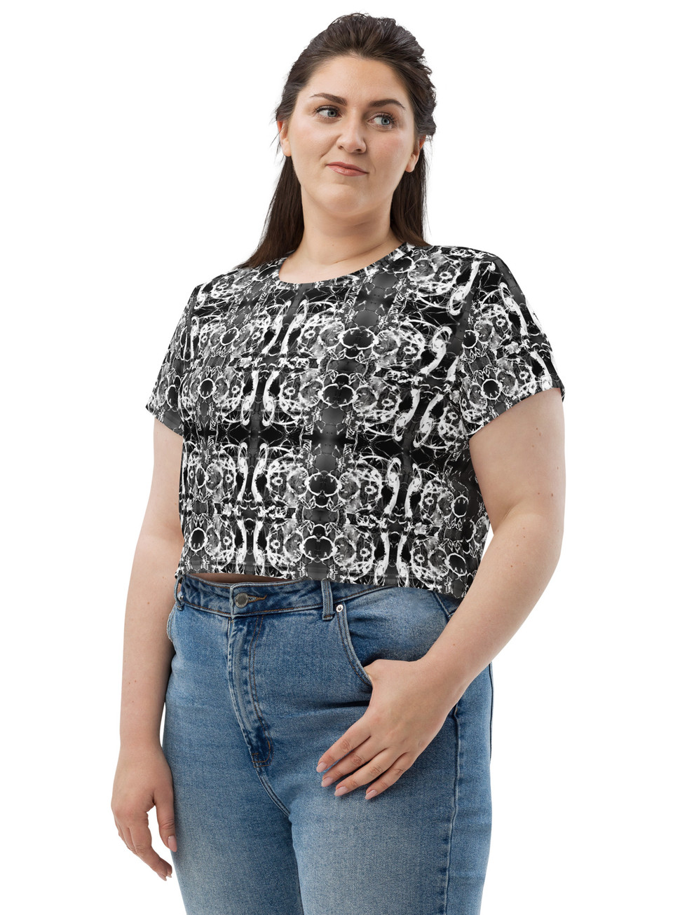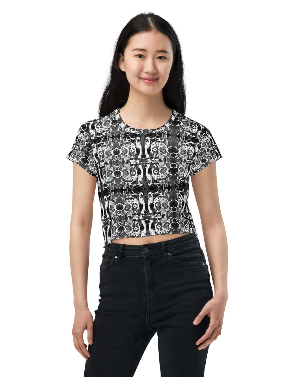 Looking for you next wardrobe favorite? Well, look no further because this crop tee is printed and sewn to fit you just right. To top that off, the original all-over design is definitely worth showing off, so don't hesitate to own one of these tees - they're meant to be adored.